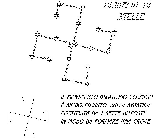 Al centro campeggia una stella più grande e splendente; altre sedici stelle meno luminose ruotano lentamente attorno a quella centrale, formando come un’immensa croce uncinata(svastica).